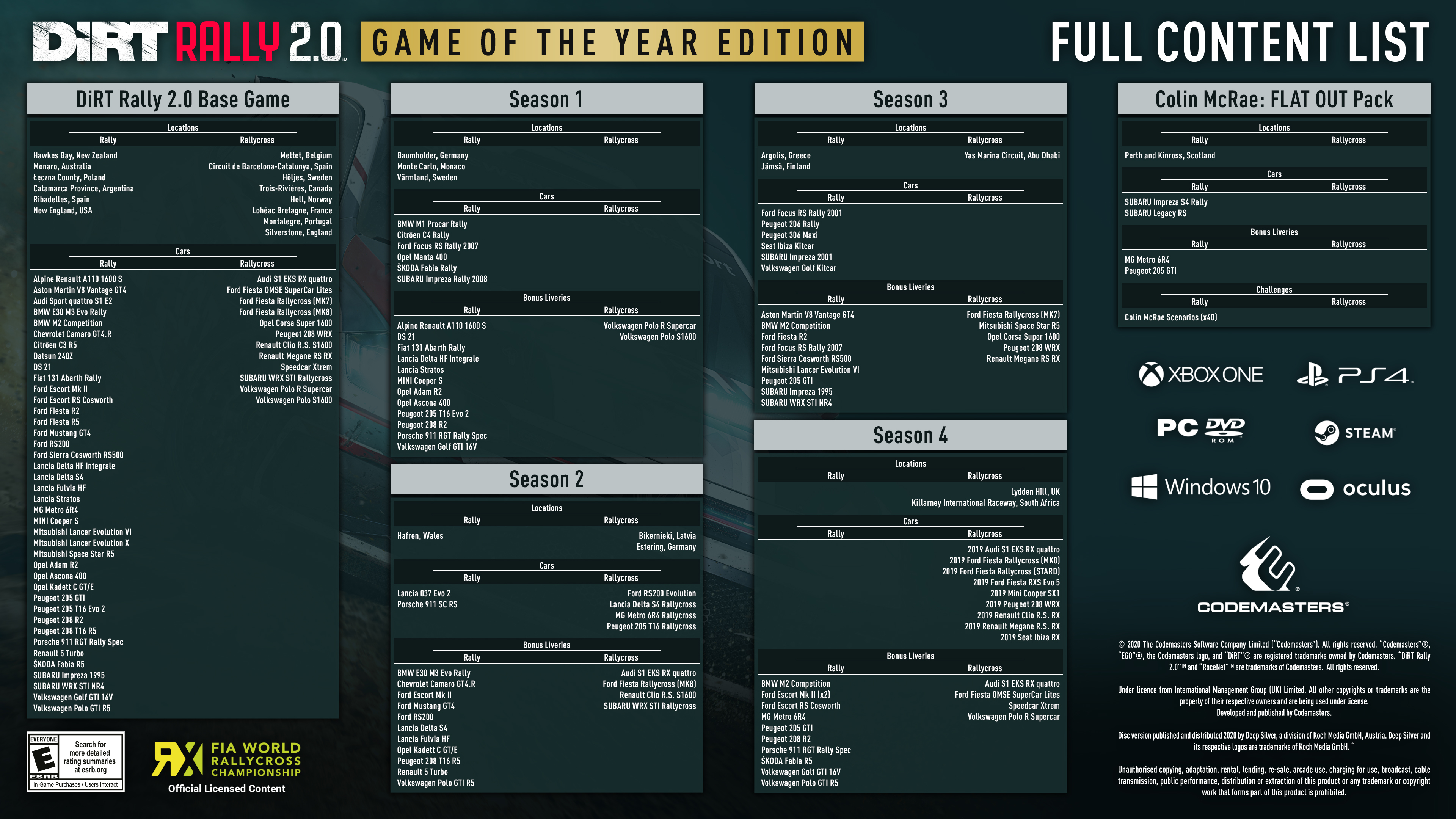 DiRT Rally 2.0 Game of the Year Edition provides the most comprehensive rally and rallycross experience ever made, with over 80 cars and 26 locations to take on the world with.