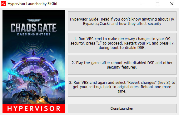 Run “VBS.cmd” in the game folder – you might want to download fresh version here: https://fitgirl-repacks.site/hypervisor-guide/